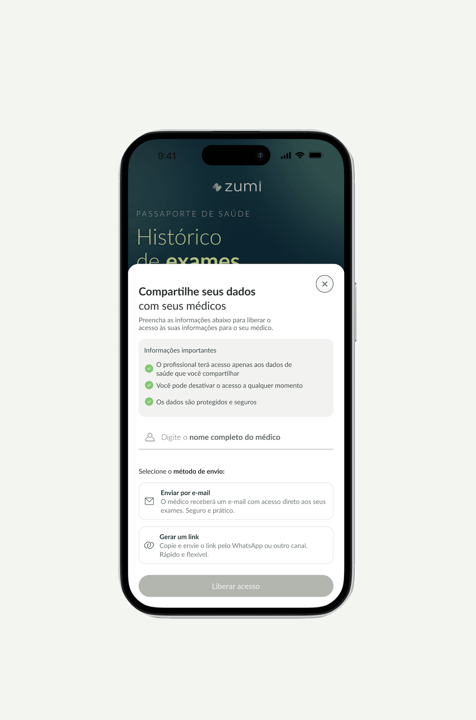 Compartilhe exames e informações de saúde com médicos e profissionais de forma simples e segura.