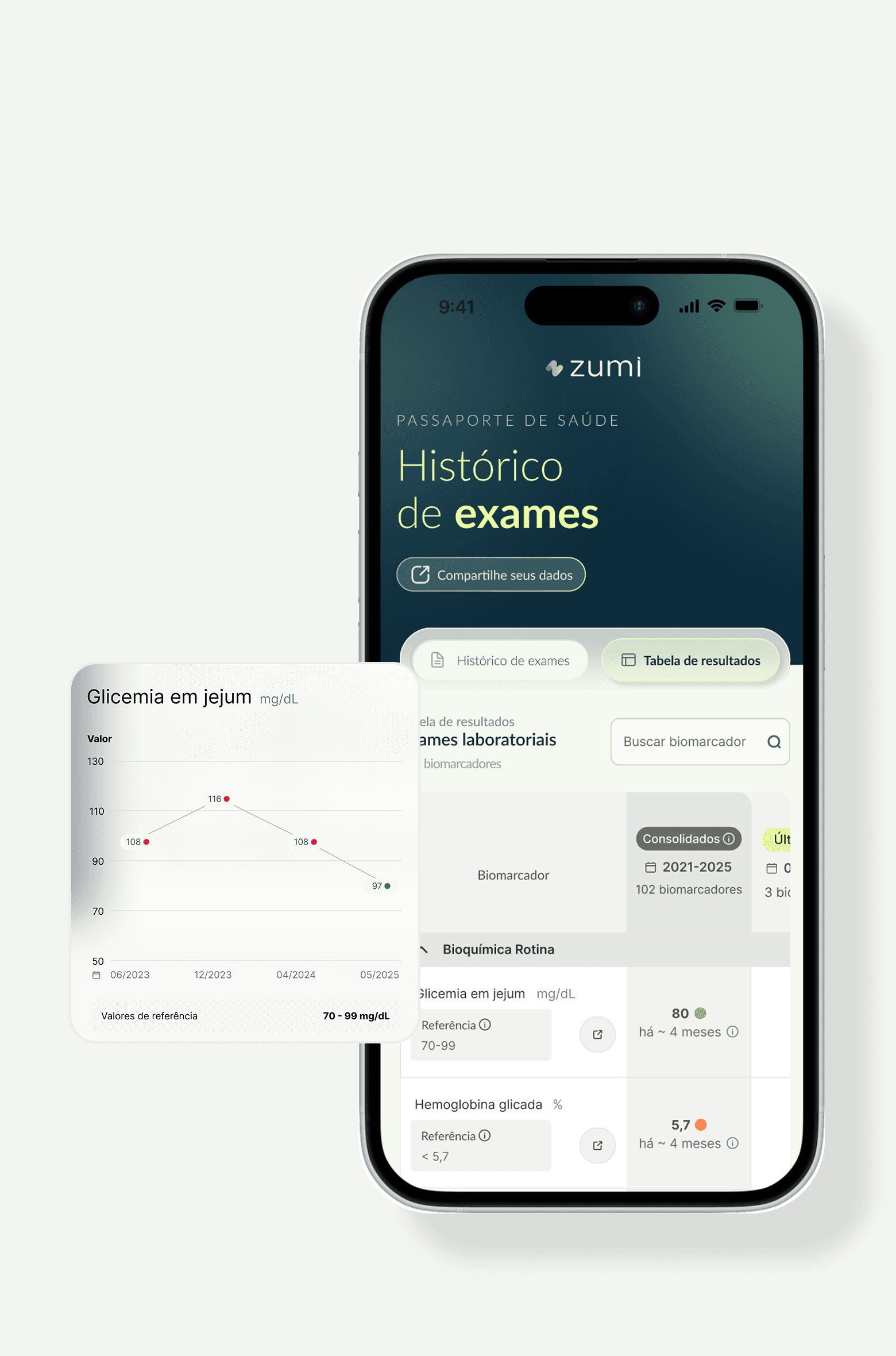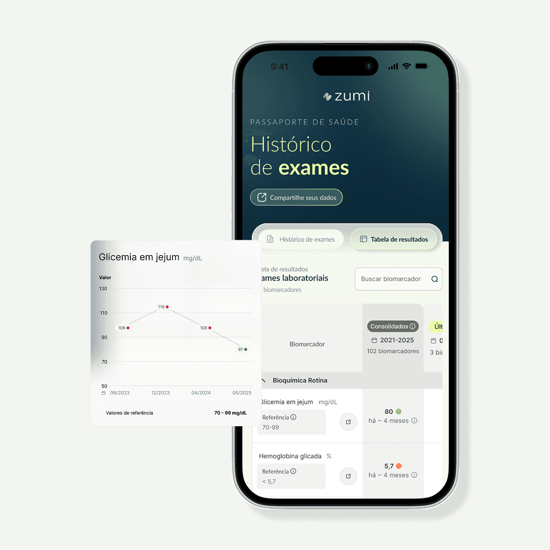 A Zumi organiza seus exames e histórico em um só lugar, para você entender sua evolução com mais clareza.